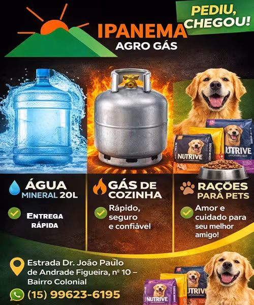 Agro Ipanema – Água mineral, gás de cozinha, rações para pets, produtos para piscina e carvão. Entrega rápida, preço justo e atendimento confiável em Araçoiaba da Serra. Pediu, chegou!